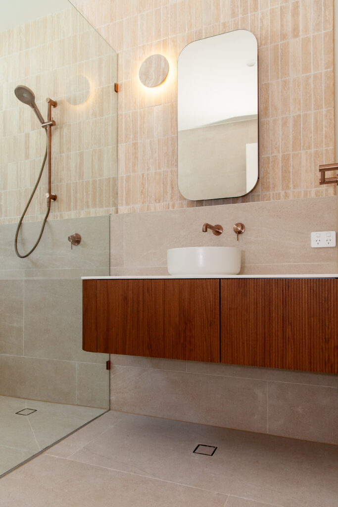 A complete bathroom transformation featuring contemporary tiles, freestanding bath, and custom vanity.
