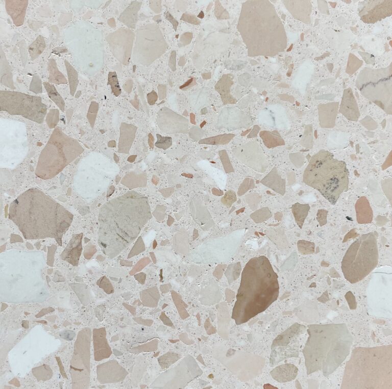 An authentic Italian terrazzo tile in warm earth tones. Handcrafted with natural stone aggregates at 20mm thickness. Ideal for creating a timeless terrazzo floor with natural character.