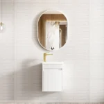 Wall hung curved vanity crafted from high moisture resistant plywood with Oak timber veneer, featuring soft-close DTC runners and multiple colour options.