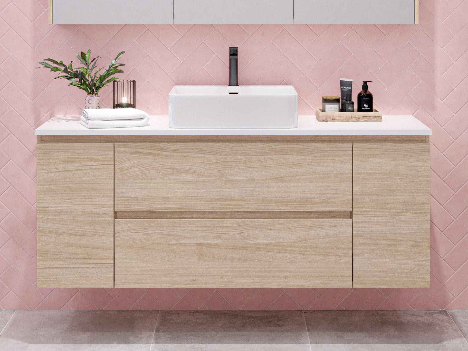 Spacious vanity with wide drawers and door storage, featuring 20mm SilkSurface slab top and multiple basin configurations. 10-year warranty.