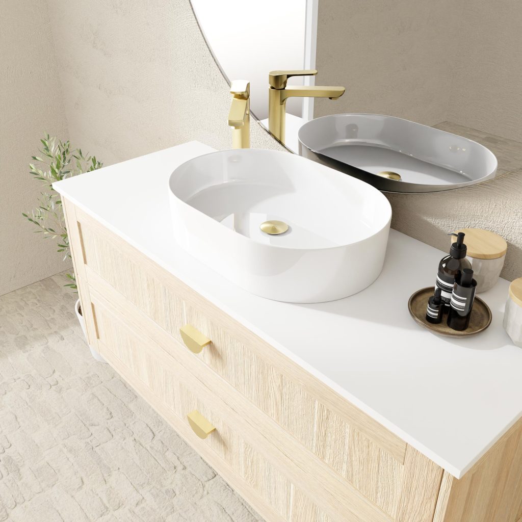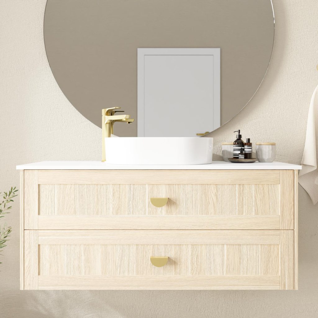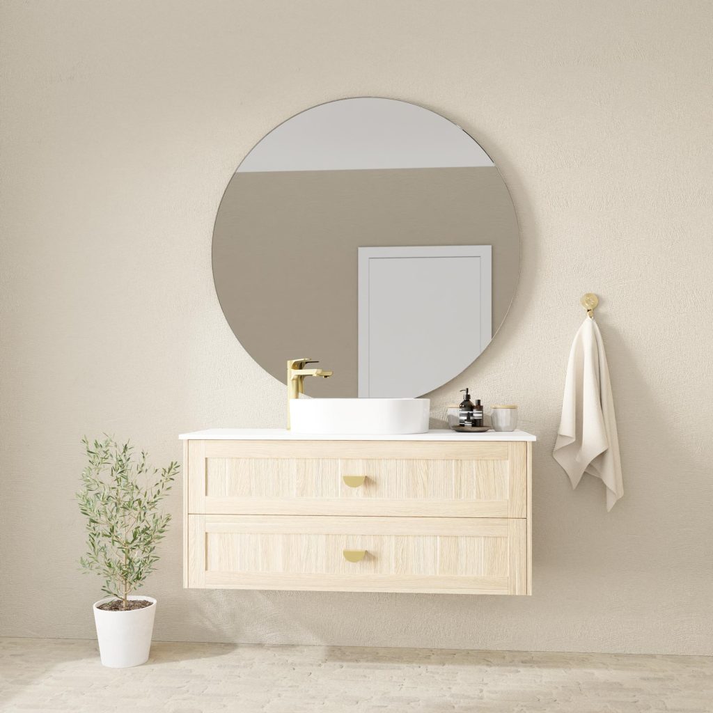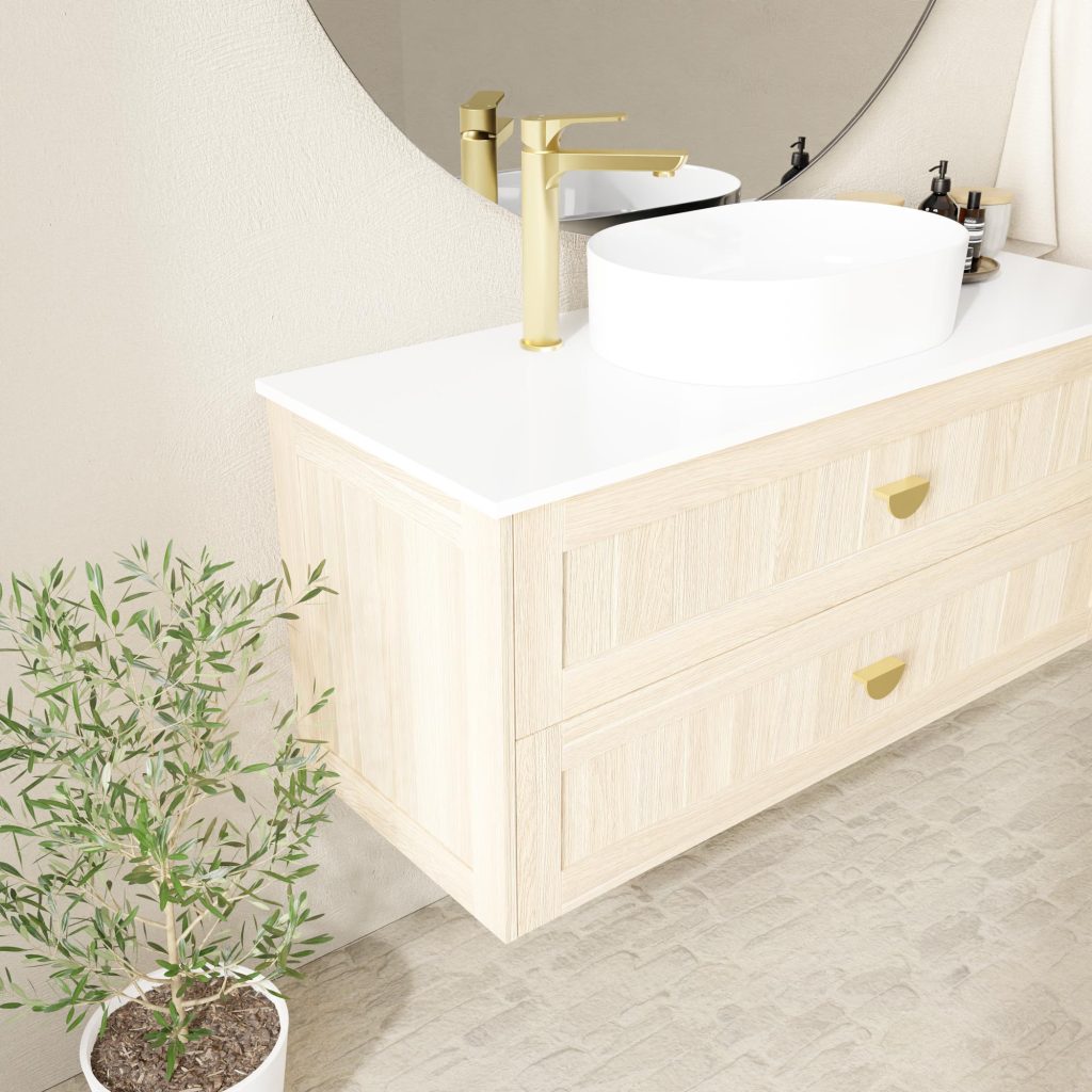 Stunning five-panel shaker door cabinet creating a sophisticated yet calming look. Wall-mount only with soft-close doors and drawers. Available in 12 distinctive Duragrain finishes with multiple benchtop options including Casa ceramic, Symphony, Caesarstone, Vasari, and Dekton.