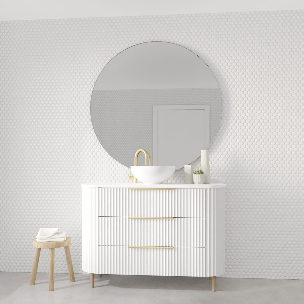 Gracefully curved fluted vanity cabinet offering both style and practicality with ample storage. Available in 2-drawer and 3-drawer configurations with wallmount or leg options. Choose from 20 elegant Thermograin finishes.