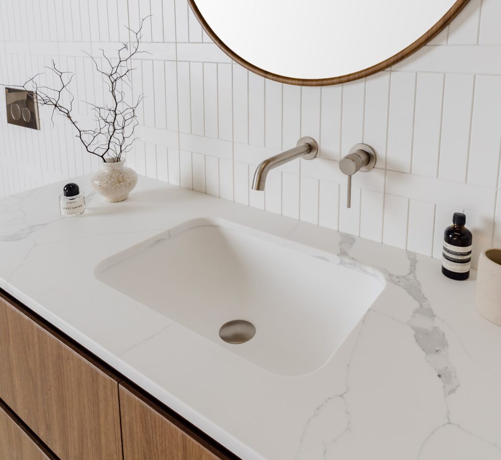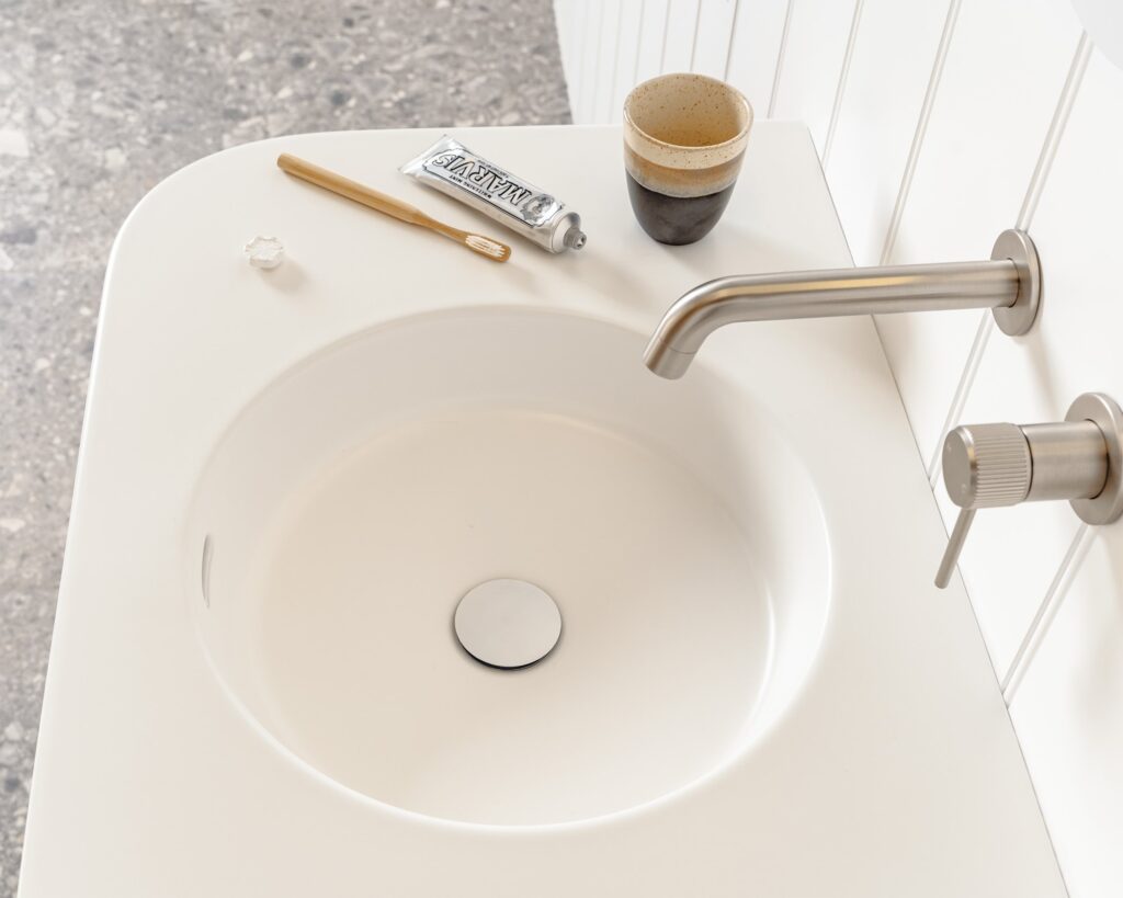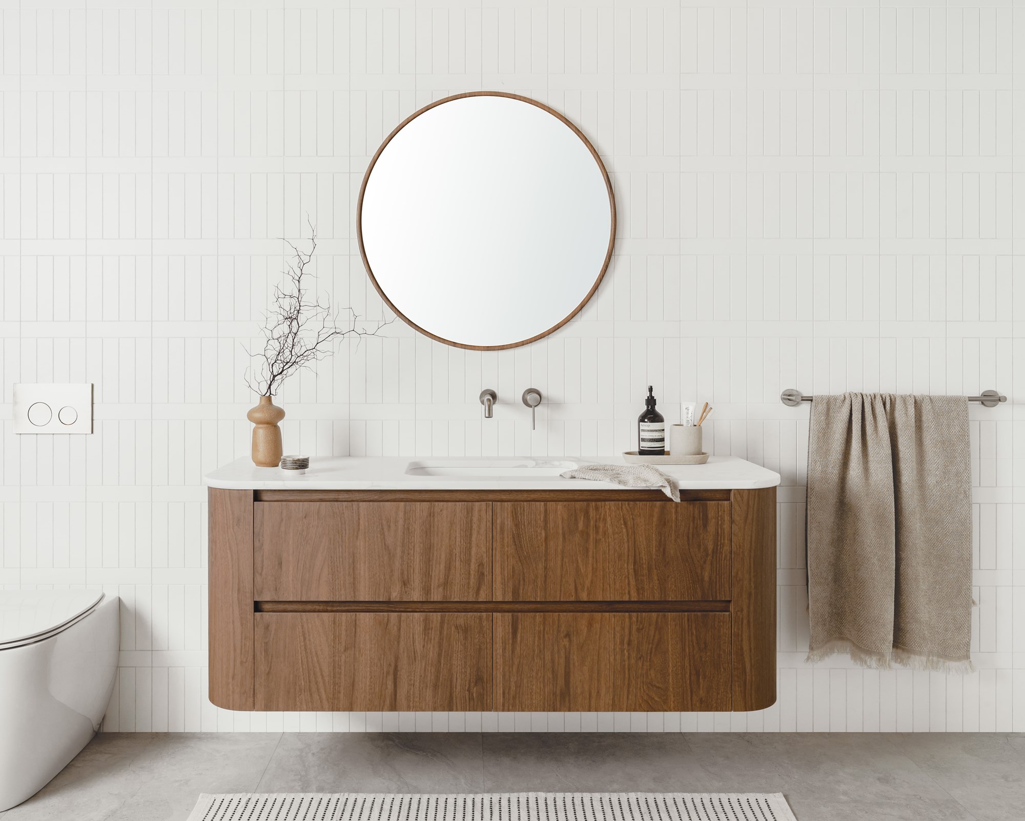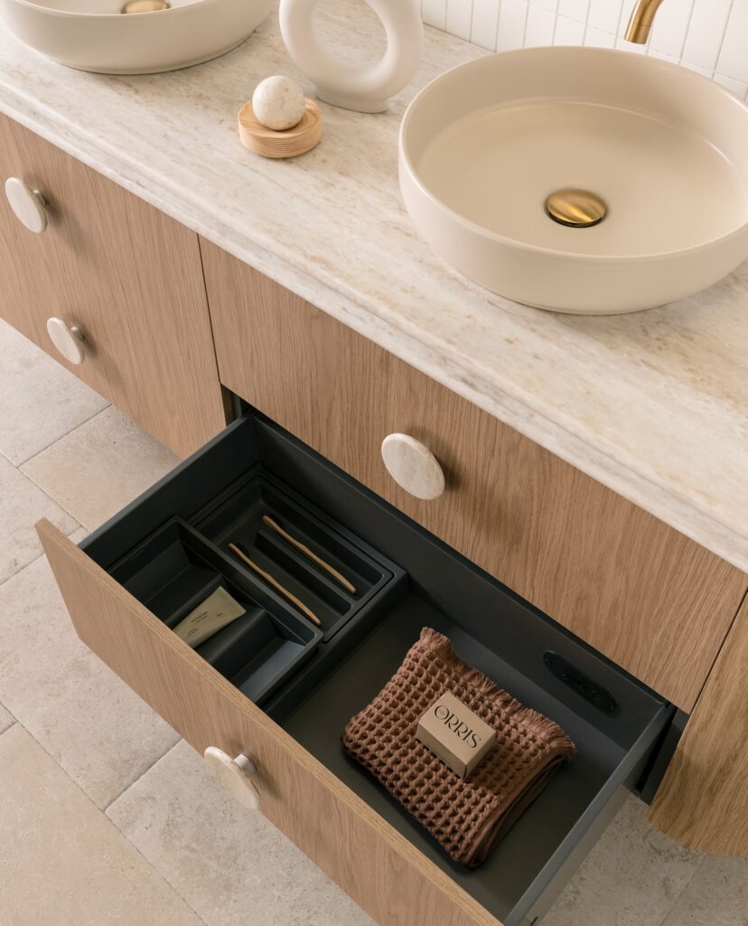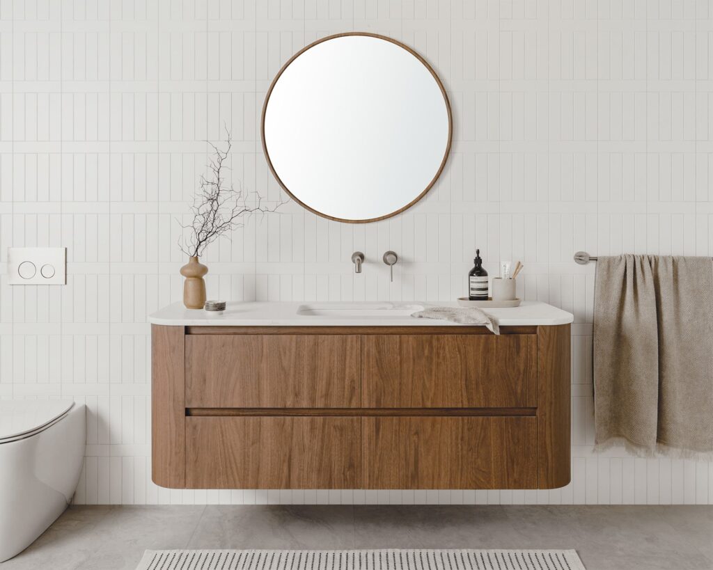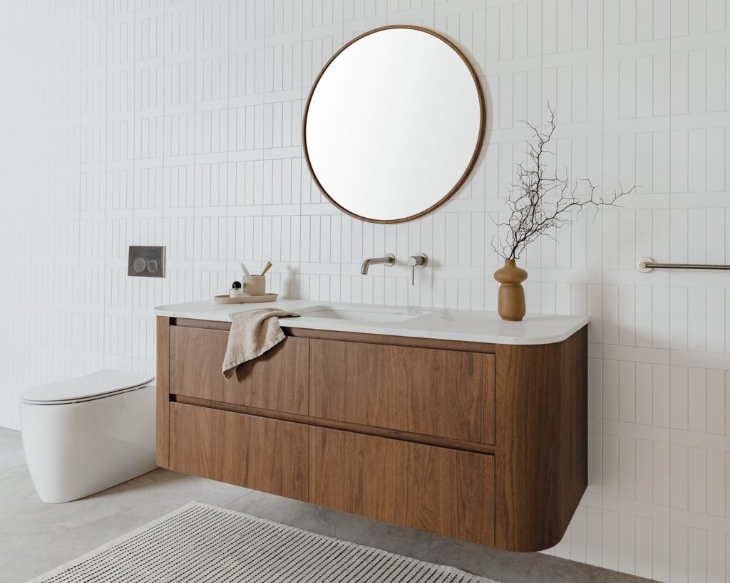 Wall hung twin all-drawer model with curved ends, featuring innovative ceramic, benchtop, or imperial top options in multiple cabinet finishes.