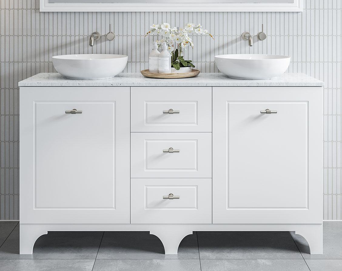 Painted vanity with routed front panels and detailed legs, available in custom paint colours with multiple top and basin configurations. 10-year warranty.